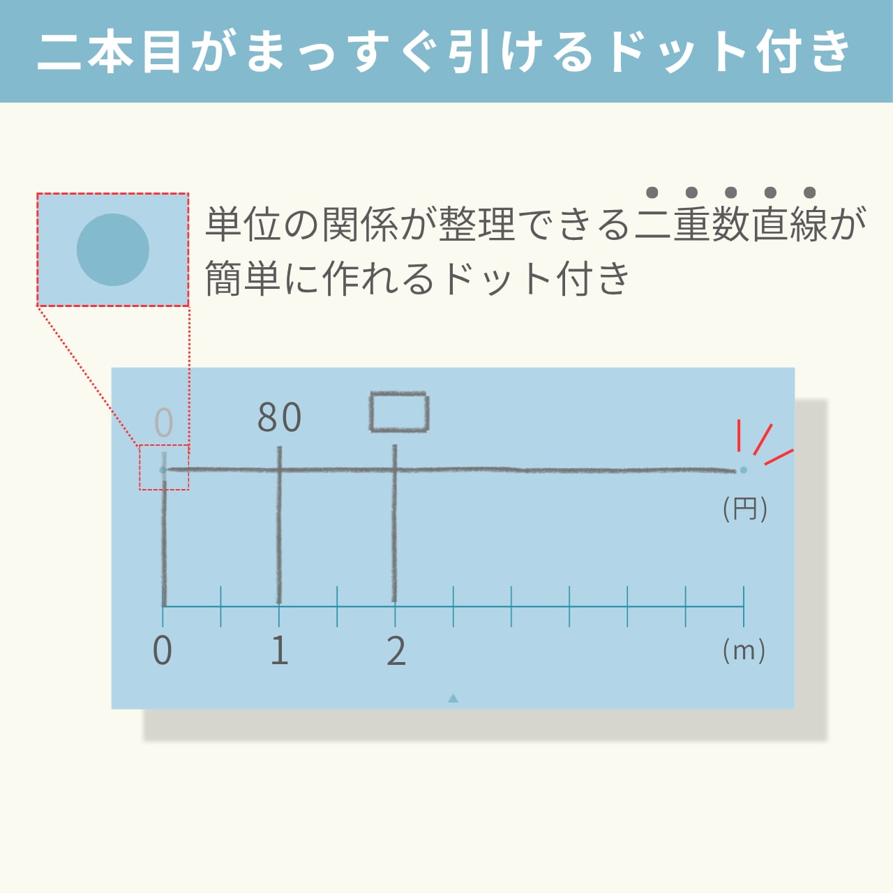 二本目がまっすぐ引けるドット付きで、二重数直線も迷わず書けます。